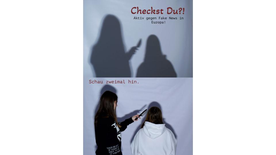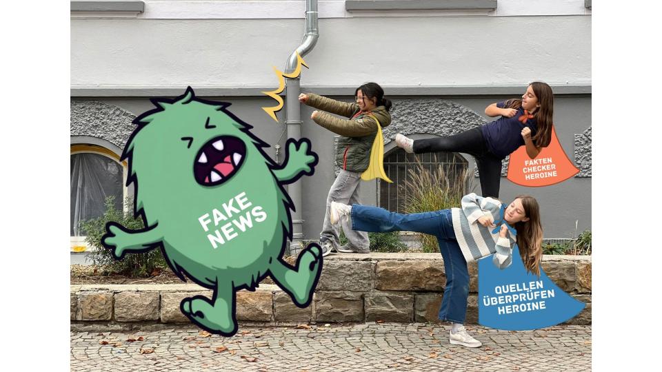 „Fake News? Wir haben das Gegenmittel!“ Pelin Akcapinar, Lina Engelhard und Anna Vicari Klasse 5/Foto-AG, Nikolaus-Ehlen-Gymnasium Velbert 2. Preis für die Sekundarstufe I im Wettbewerb EuroVisions 2025 / ©Nikolaus-Ehlen-Gymnasium Velbert