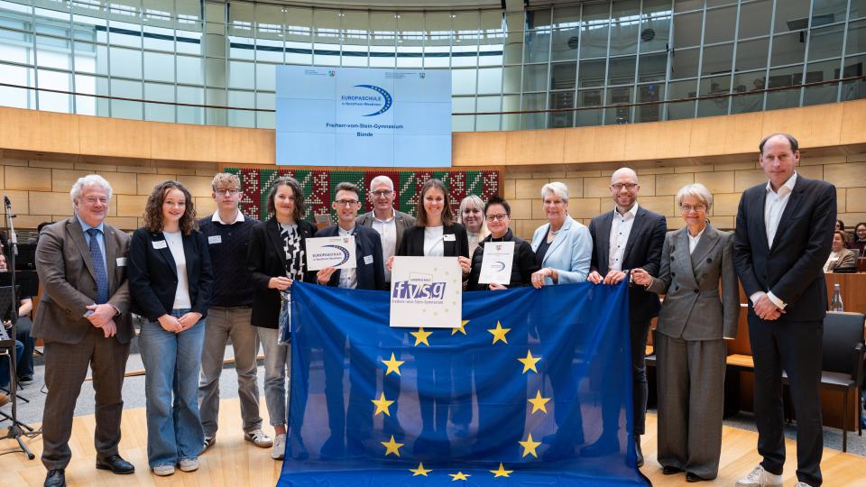 Die Landesregierung hat fünf weitere Schulen mit dem Zertifikat „Europaschule in Nordrhein-Westfalen“ ausgezeichnet. Neu hinzugekommen sind Schulen aus Bünde, Dortmund, Herne, Paderborn und Rietberg. 25 Schulen wurden anlässlich ihres 15-jährigen Bestehens als Europaschule geehrt. Europaminister und Chef der Staatskanzlei Nathanael Liminski, die Ministerin für Schule und Bildung Dorothee Feller und der Landtagspräsident André Kuper hatten gemeinsam zur 15. Jahrestagung der Europaschulen in den Düsseldorfer Landtag eingeladen.