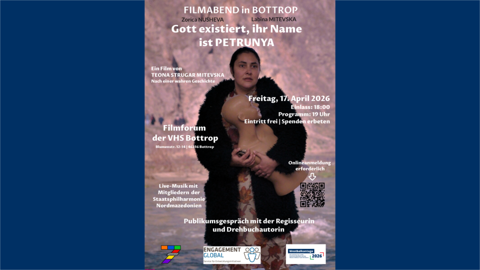 Der Startschuss des Festaktes der WestbalkanTage NRW 2026 bildet am 17. April 2026 ab 18.00 Uhr eine besondere Filmvorführung im Filmforum der VHS Bottrop. Gezeigt wird der vielfach beachtete Film „Gott existiert, ihr Name ist Petrunya“ der nordmazedonischen Regisseurin Teona Strugar Mitevska, der 2019 im Rahmen der 69. Berlinale seine Uraufführung feierte und international für seine kraftvolle Auseinandersetzung mit gesellschaftlichen Strukturen und Geschlechterrollen gewürdigt wurde.