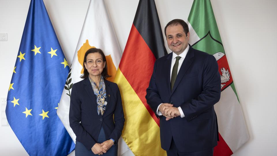 Die Republik Zypern hat am 1. Januar 2026 zum zweiten Mal den turnusmäßig wechselnden Vorsitz im Rat der Europäischen Union übernommen. Gemeinsam mit Maria Papakyriakou, zyprische Botschafterin in Berlin, hat sich Europaminister Nathanael Liminski am Donnerstag, 16. April 2026, über die Prioritäten der Präsidentschaft ausgetauscht.